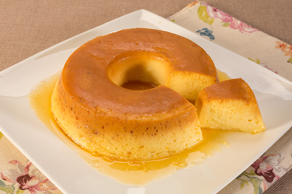 Montagem: Espalhe a calda na assadeira com furo no meio e despeje o líquido do pudim. Leve para cozinhar em banho-maria no forno preaquecido a 180 °C por aproximadamente 50 minutos. Após assar deixe esfriar e desenforme.