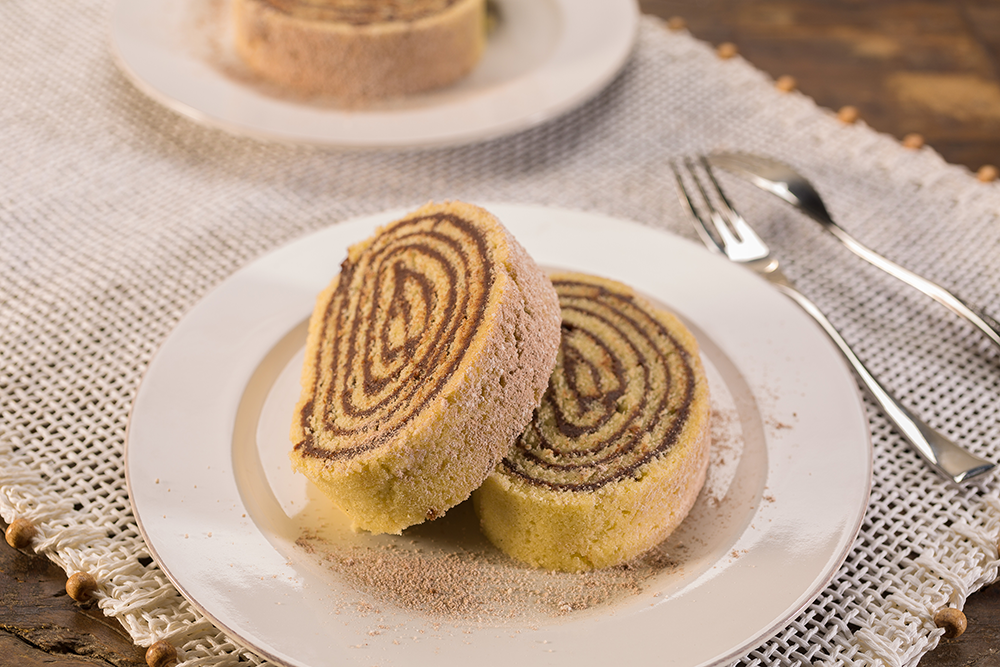 Após o rocambole assado espalhe o recheio e enrole. Peneire Açúcar Gelado e corte no tamanho desejado.