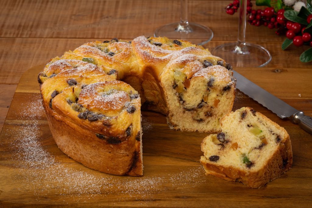 Creme de Confeiteiro: Em uma panela, coloque o leite e leve ao fogo. Quando começar a ferver, acrescente o Pó para Preparo de Creme de Confeiteiro, misture bem por 2 minutos, desligue. Cubra com filme plástico e deixe esfriar. Depois de frio adicione o coco ralado seco, as frutas cristalizadas, a uva passa, as Gotas de Chocolate e mexa, reserve.