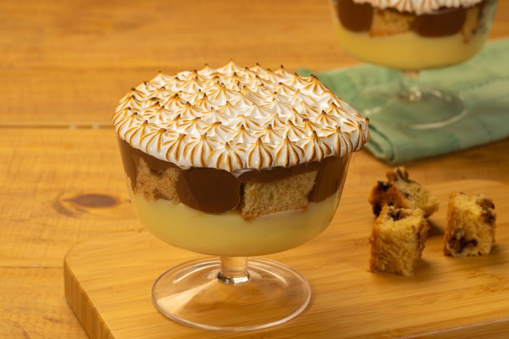 Intercale camadas de panetone em pedaços, o creme de confeiteiro e o creme de confeiteiro sabor chocolate. Coloque a Cobertura em uma Manga de Confeitar com Bico 21 e decore a taça.
