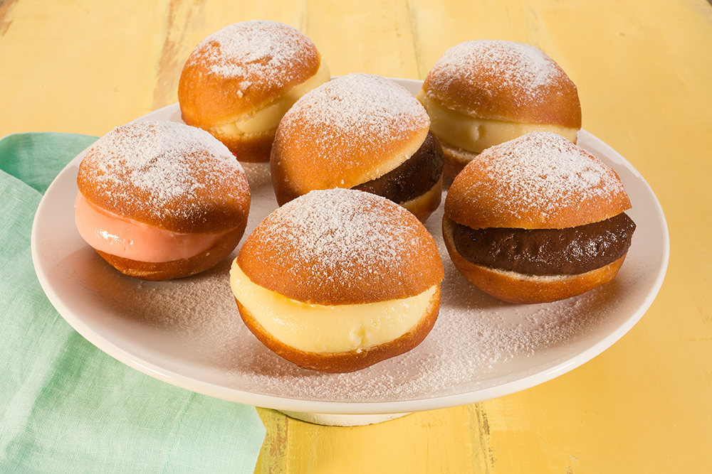 Corte os sonhos e recheie com os cremes branco, de morango e de chocolate. Para finalizar peneire Açúcar Gelado.