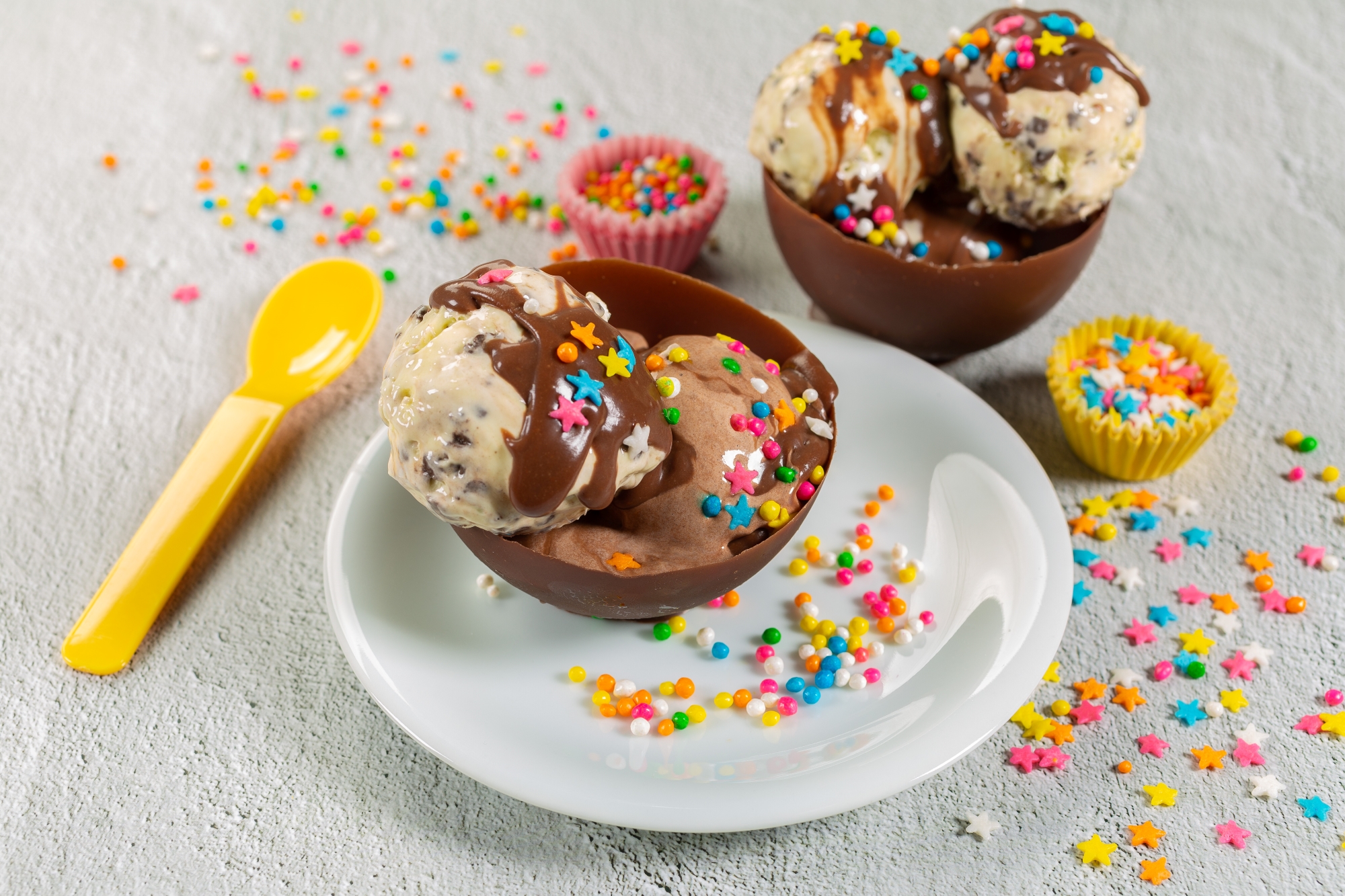 Cobertura e Decoração: Em um recipiente, derreta a Cobertura Meio Amarga em banho-maria ou micro-ondas, acrescente o creme de leite e misture. Reserve. Com o auxílio de um boleador próprio para sorvete, faça bolas com o sorvete de maracujá e com o sorvete trufado de chocolate. Em seguida, espalhe a cobertura, decore com Choco Power Ball Colorido e o Confeito Figura Estrelinha.