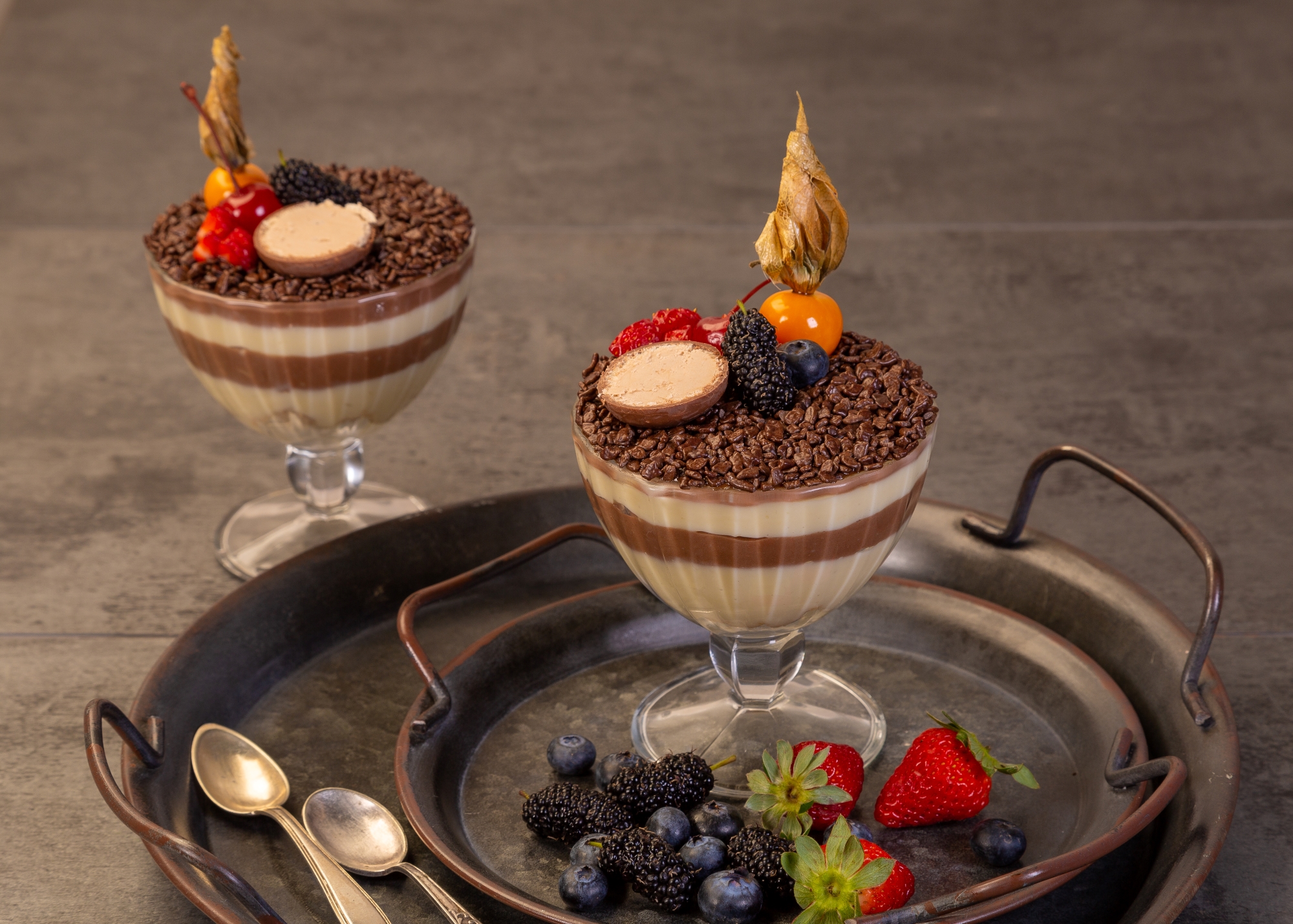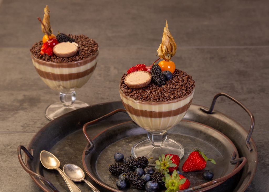 Montagem e Decoração: Intercale em taças de sua preferência camadas do creme de chocolate ao leite e do creme chocolate branco. Espalhe os Flocos Macios e decore com bombom fatiado, morango picado, mirtilo, physalis e amora.