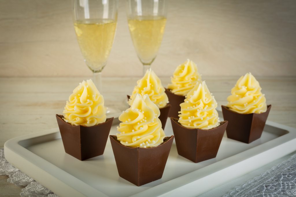 Coloque o recheio de creme em uma manga de confeitar e recheie os copinhos. Em uma manga de confeitar com bico pitanga, coloque a cobertura de creme de manteiga e cubra o recheio. Em seguida, decore com Miçangas Brancas.
