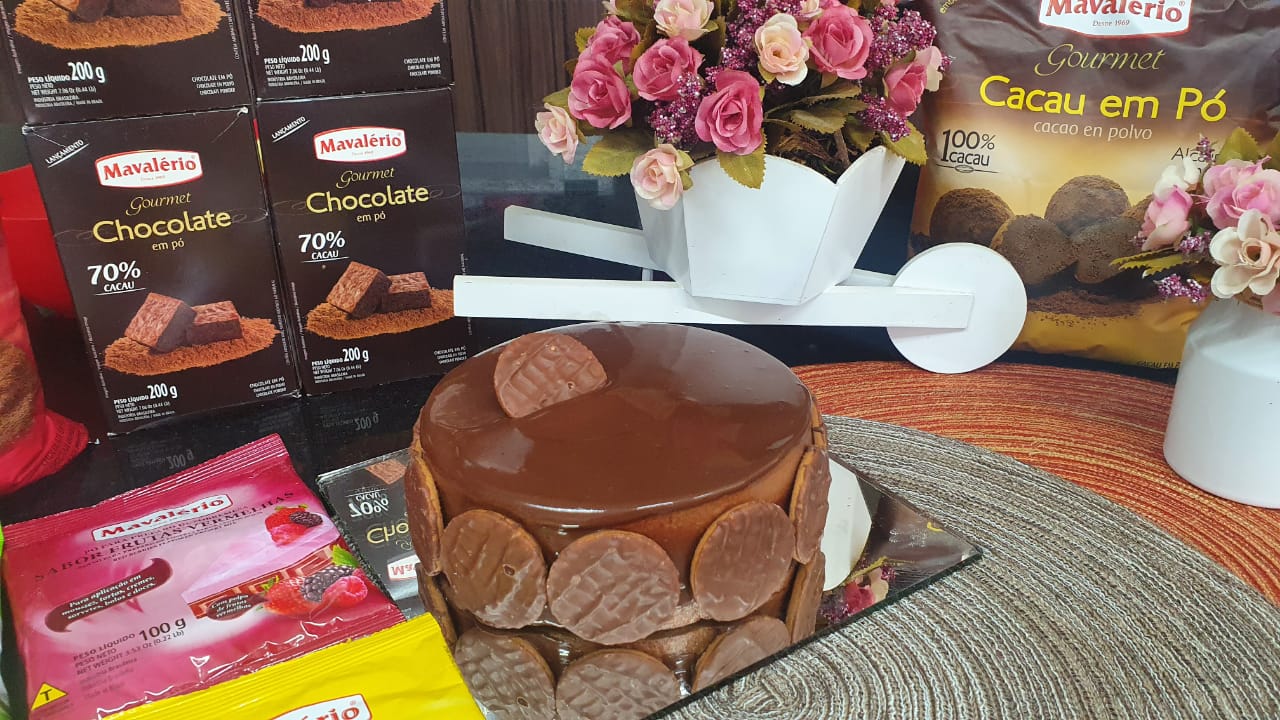 Intercale massa, creme, massa e finalize com a cobertura e decore com bolachas na lateral.