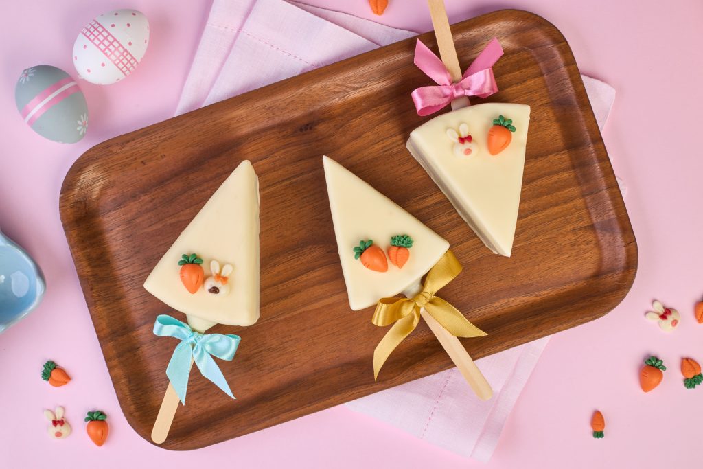 Em um aro 20 cm coloque a massa, acrescente a mousse de chocolate, em seguida a mousse de limão, finalize deixando a superfície bem reta e leve para congelar por aproximadamente 5 horas. Retire do congelador e corte em 8 partes em formato de triângulo. Banhe a ponta do palito na cobertura e coloque no centro da fatia. Banhe as fatias por completa na cobertura branca e decore com as cenourinhas.