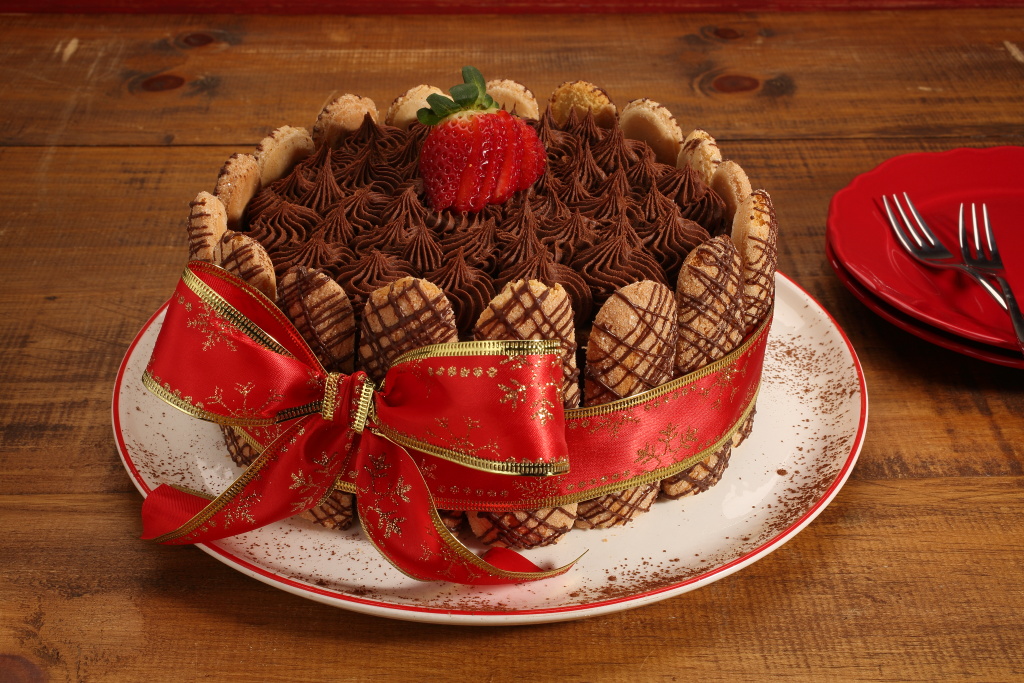 Em um recipiente derreta a Cobertura Meio Amarga em banho-maria ou micro-ondas. Coloque em uma manga de confeitar e faça risquinhos nos biscoitos champanhe. Reserve. Monte a torta em um aro untado, intercalando fatias de panetone de chocolate e a trufa aerada, finalizando com a trufa. Em seguida retire o aro e coloque os biscoitos em toda lateral da torta, amarre uma fita e decore com morango.