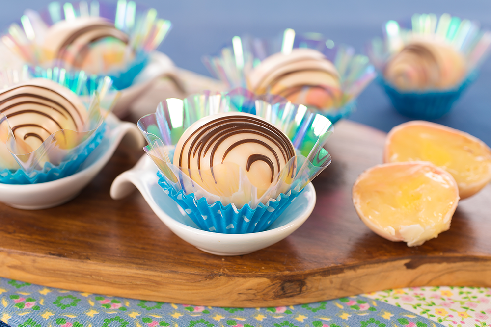Modele bolinhas, abra e recheie com o creme de maracujá, boleie novamente e banhe na Cobertura Branca derretida em banho-maria ou micro-ondas. Para finalizar decore com risquinhos de Cobertura ao Leite derretida em banho-maria ou micro-ondas na lateral da trufa.