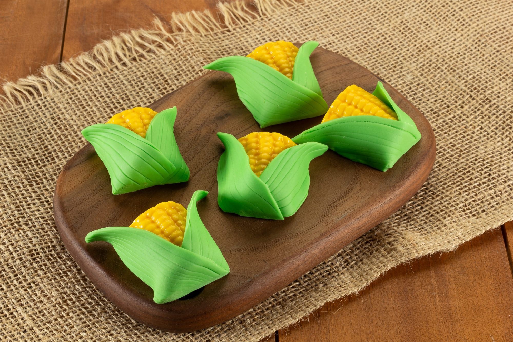 Recheie as casquinhas com o brigadeiro de milho já frio, feche com a Cobertura amarela derretida e reserve. Tinja a Pasta Americana com o corante em gel verde, abra com o auxílio de um rolo, corte duas folhas e cole na espiga.