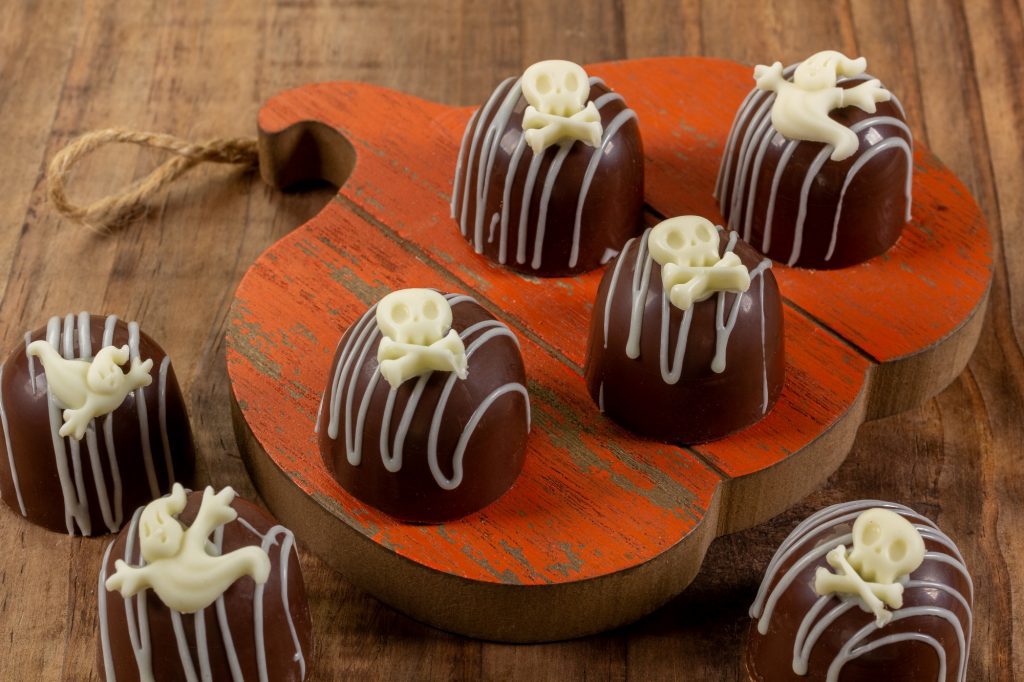Montagem e Decoração: Recheie as casquinhas com o recheio trufado de frutas vermelhas e feche com a Cobertura Blend derretida e deixe secar. Em um recipiente, derreta a Cobertura Branca em banho-maria ou micro-ondas. Coloque em um saco de confeitar, preencha forminhas de silicone nos formatos de caveira e fantasma, leve à geladeira até secar, retire, desenforme e reserve. Faça risquinhos na trufa e cole a caveira e o fantasminha.