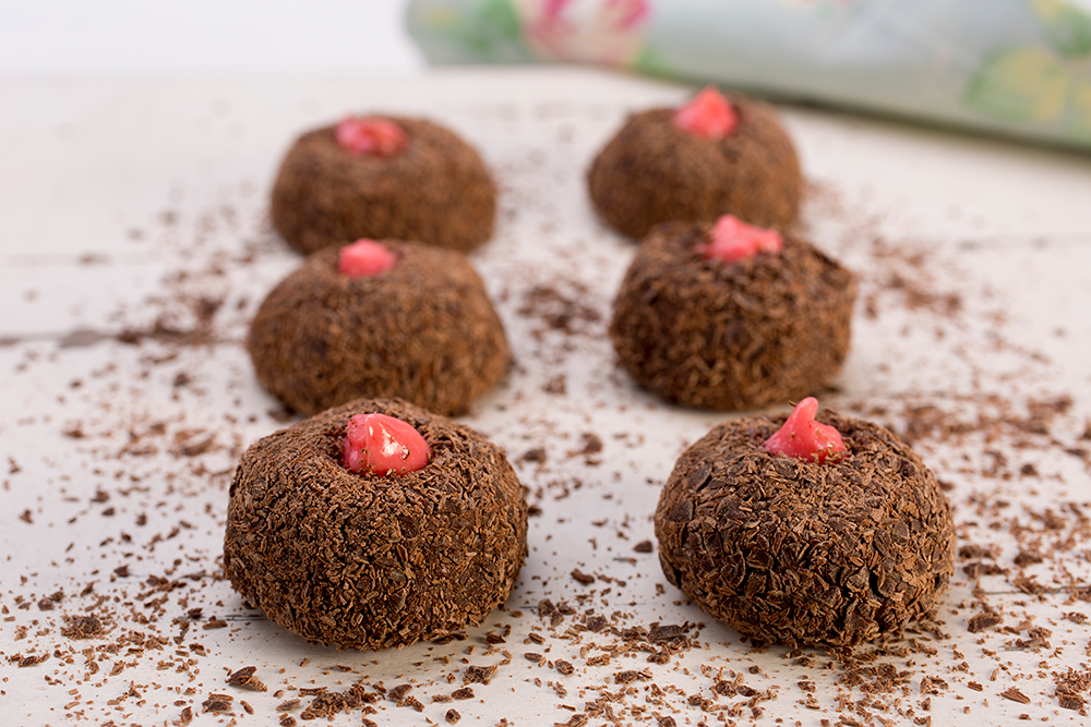 Modele bolinhas de trufas, abra e coloque um Choco Power Ball, boleie e passe nas raspas de Cobertura Meio Amarga e para finalizar, com o auxílio de uma manga de confeitar injete o recheio de Morango.