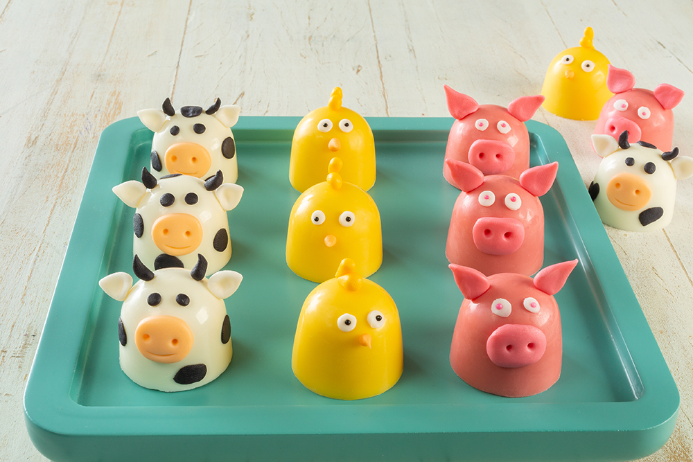 Recheie as casquinhas brancas com o recheio Trufa de Limão, as casquinhas amarelas com o recheio Trufa de Maracujá e as casquinhas rosas com o recheio Trufa de Morango e feche com a Cobertura derretida. Reserve. Tinja a Pasta Americana com corante em gel preto, pele, amarelo e rosa. Na trufa branca modele orelhas, chifres, focinhos, olhos e manchas. Na trufa amarela modele cristas, olhos com Pasta Branca e Miçanga Preta, e bico. Na trufa rosa modele orelhas, focinhos e olhos com Pasta Branca e Miçanga Rosa.