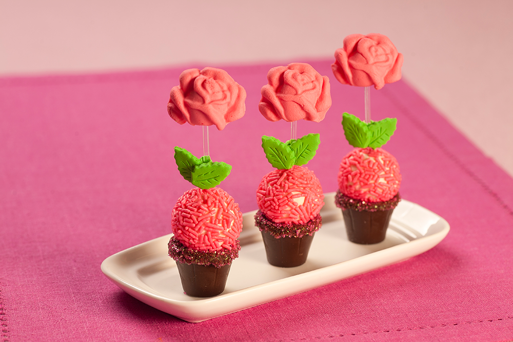 Mergulhe a parte da cavidade dos vasinhos na Cobertura ao Leite já derretida, em seguida envolva no Açúcar Rosa. Recheie os vasinhos com o creme de limão e coloque o brigadeiro já enrolado. Modele mini rosas com a Pasta Americana tingida de rosa e modele folhas verde com a Pasta Americana tingida de verde, finalizando a decoração.