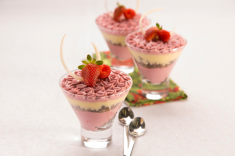 Intercale em taças camadas de creme de Frutas Vermelhas, farofa de Choco Power Ball e o brigadeiro branco, terminando com creme de frutas vermelhas. Decore com o arabesco de Chocolate, morango e framboesa.