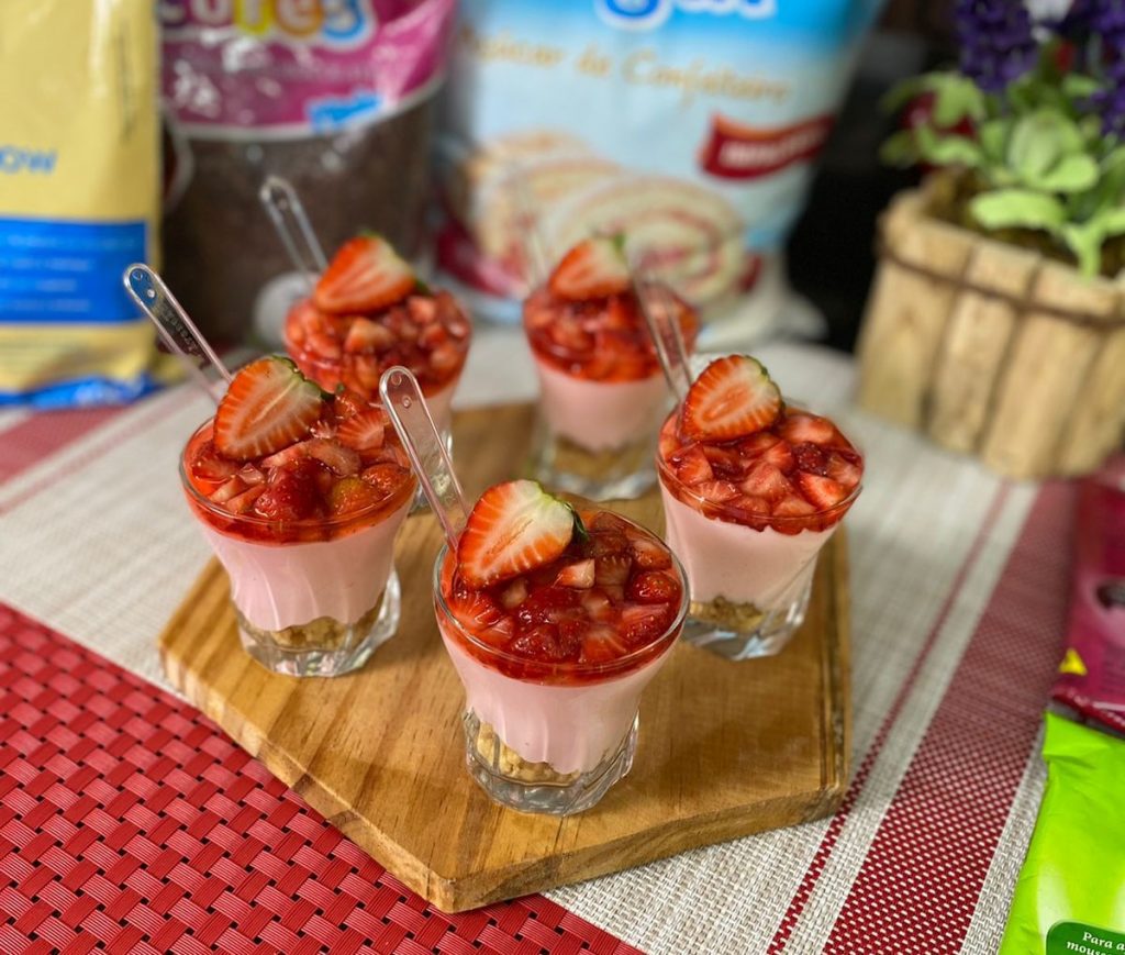 Mousse de Morango: Em um recipiente misture o leite condensado, o Pó Sabor de Morango muito bem, acrescente o creme de leite, mexa. Por último coloque o marshmallow batido e misture.