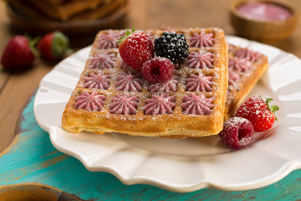 Com o auxílio de uma manga de confeitar e um bico pitanga pequeno, coloque a Cobertura dentro dos quadradinhos do waffle, coloque furtas vermelhas frescas e finalize peneirando o Açúcar Gelado.